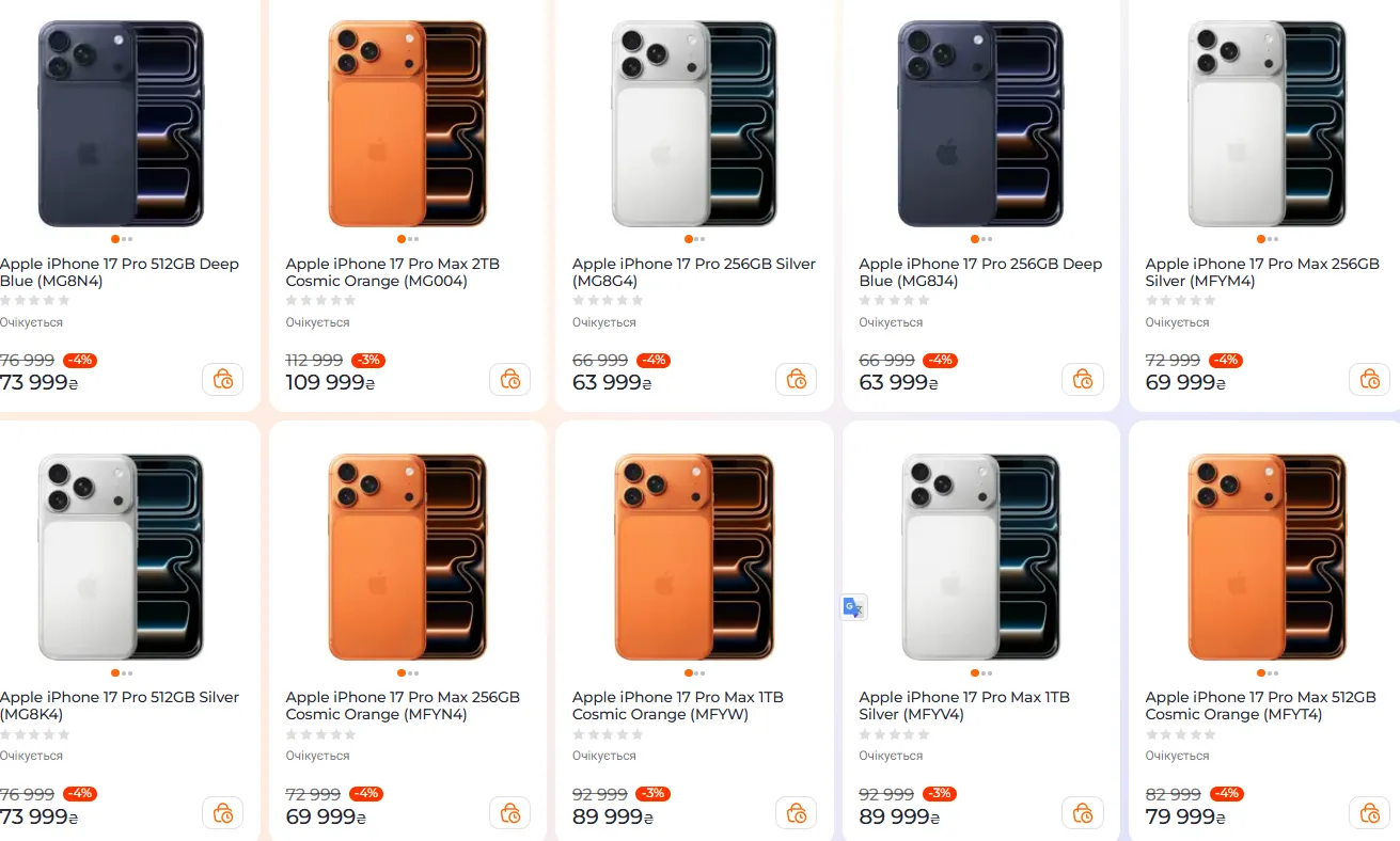 - Apple iPhone 17 Pro Max 2 ТБ – 112 999 гривень