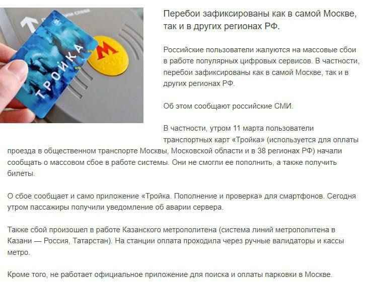 Тож через "збій" власники транспортних карток у Москві та Казані не могли оплатити квитки, поповнити картку проїзду та розрахуватися за паркування,