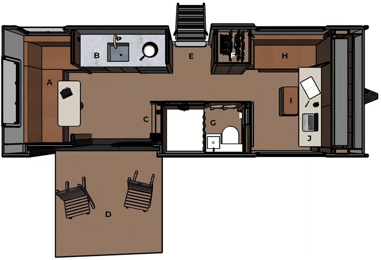 Універсальна задня зона відпочинку вдень слугує обідньою зоною та зоною для перегляду телевізора, а вночі перетворюється на двоярусне ліжко. Стіл на п'єдесталі опускається, утворюючи нижнє спальне місце, в той час, як верхнє спальне місце опускається зверху, відкриваючи вид на верхній мансардний дах.