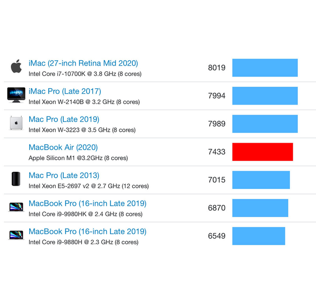 На сайті Geekbench були опубліковані результати тестування MacBook Air з 8 ГБ оперативної пам'яті і процесором M1, які працюють на базовій частоті 3,2 ГГц. Новинка набрала 1687 і 7433 бали в одно- і багатоядерному випробуванні відповідно. Для порівняння: Pro-версія ноутбука на Intel Core i9-9880H показала результат 1148/6549 балів.