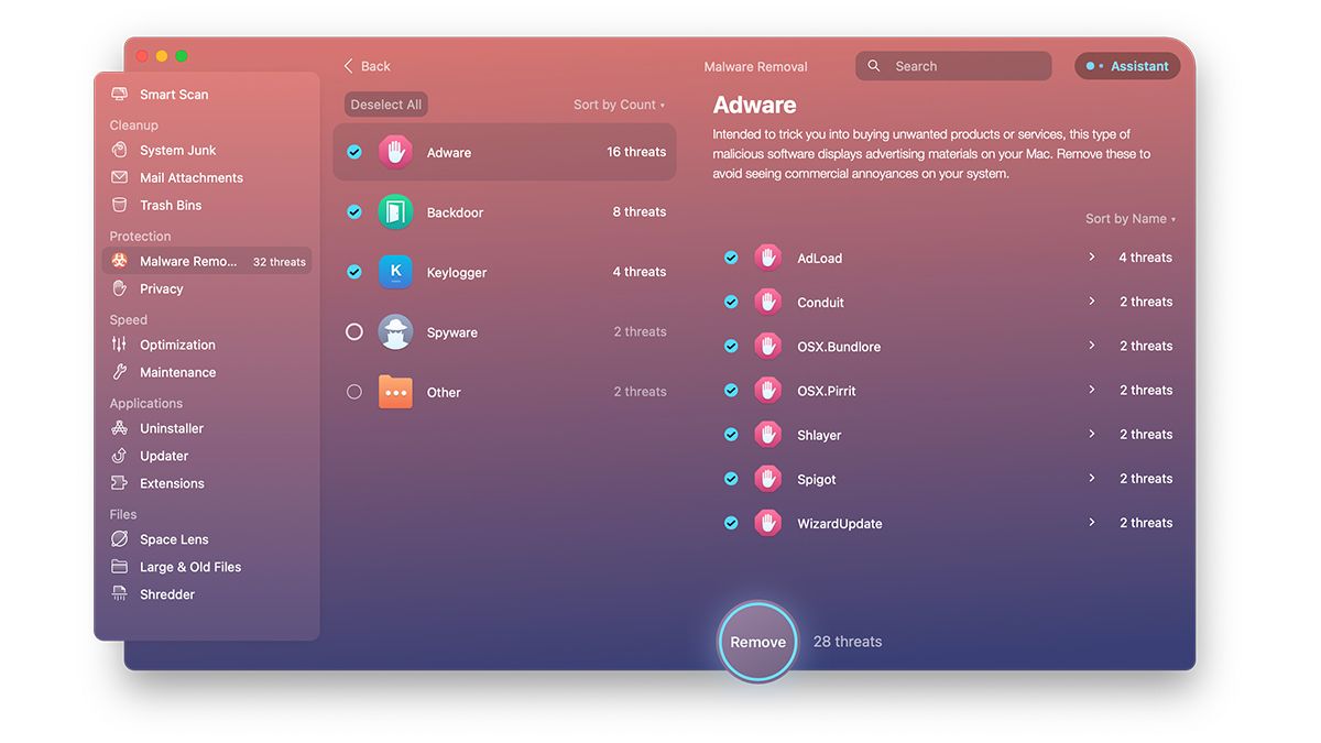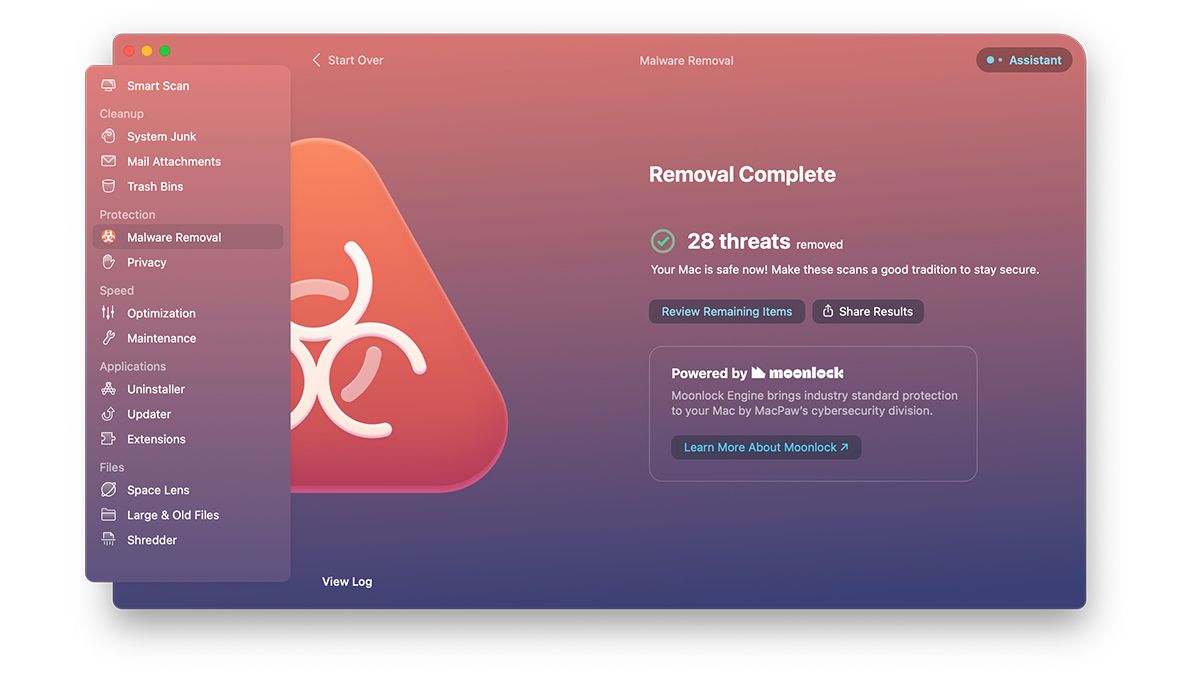 Moonlock Engine забезпечує видалення зловмисного програмного забезпечення, знаходить і видаляє всі типи загроз, які загрожують вашому Mac. Компанія обіцяє удвічі швидше сканування на комп’ютерах Mac з чипами M1 і в 1,5 раза на комп’ютерах на базі Intel.