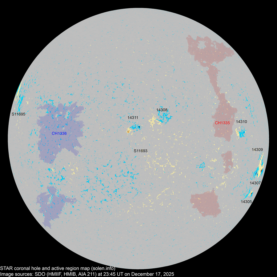 На жаль, джерело цих збурень невідоме, але потенційною винуватицею є корональна діра CH1336, яка зараз обертається до нас із західного краю сонячного диска. Хоча вона ще не дивиться прямо на нас, її посилене випромінювання цілком може розсіюватися на навколишній простір.