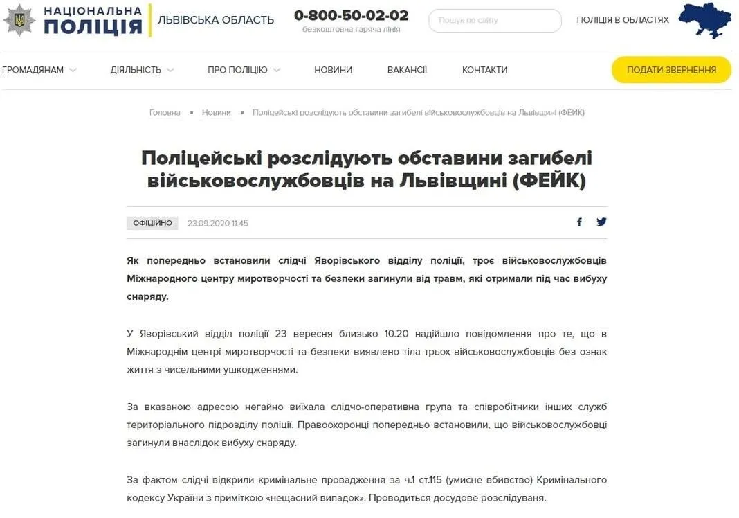 Крім "витоку на Рівненській АЕС", зловмисники також розмістили фейк на сторінці обласної поліції Львівщини. 23 вересня там з'явилася інформація про загибель трьох військових ЗСУ на Яворівському полігоні. Неправдиву інформацію вже встигла поширила низка ЗМІ, однак це фейк.