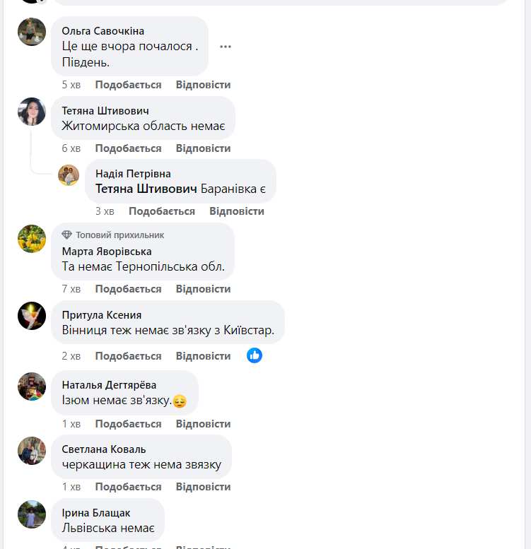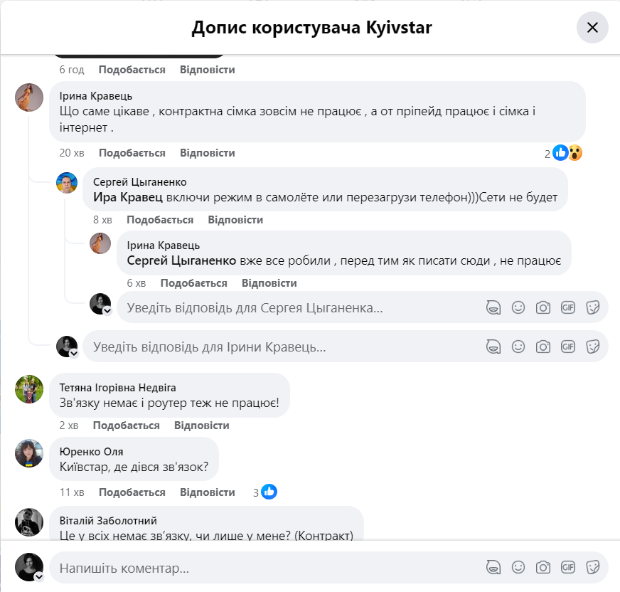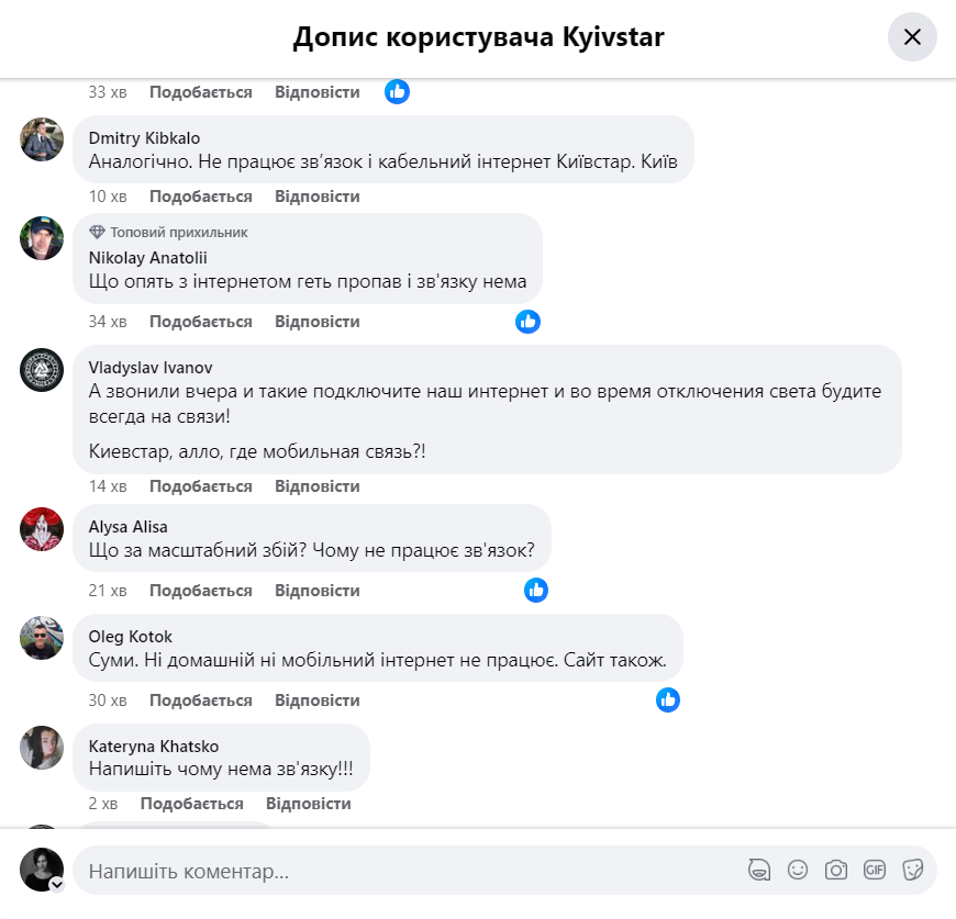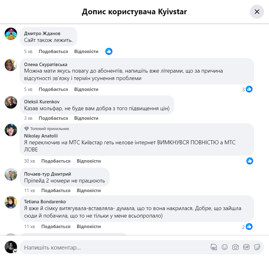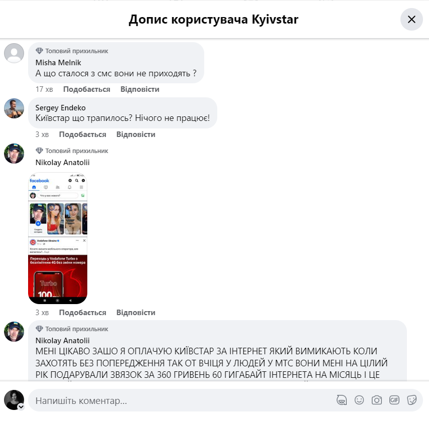 Люди під останнім дописом оператора у фейсбуці скаржаться, що не працює мережа, немає інтернету та не приходять смс-повідомлення. Про це пишуть користувачі з Києва та області, а також Сум та Івано-Франківська.