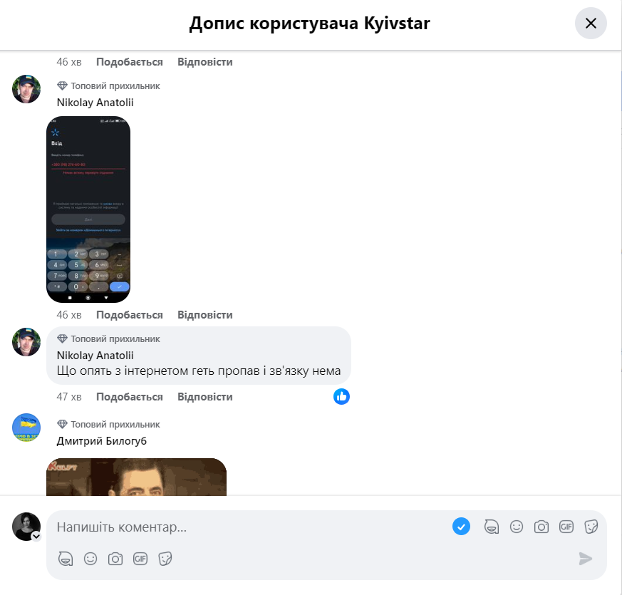 Окрім того, у коментарях під публікацією 24 Каналу в фейсбуці люди написали, що проблеми у роботі Kyivstar: