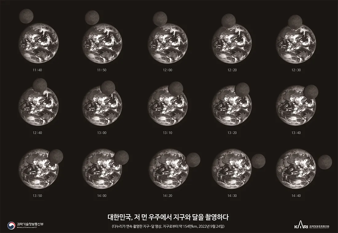 Знімки, розміщені на сайті Корейського інституту аерокосмічних досліджень (KARI), демонструють різноманітні ландшафти Місяця та два чорно-білих зображення величезної Землі, що піднімається над поцяткованим кратерами місячним горизонтом, а також зображення орбіти Місяця навколо Землі, зняте протягом декількох годин.