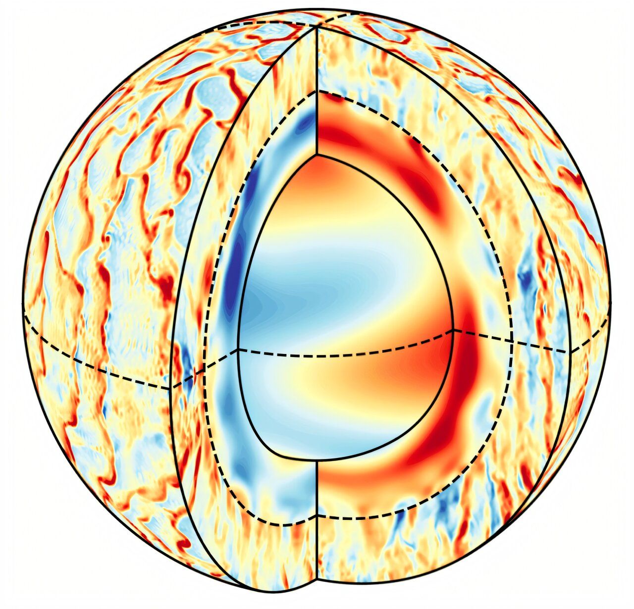 Внутрішня пунктирна лінія на цьому моделюванні показує тахоклін / Фото The Astrophysical Journal Letters/Loren I. Matilsky