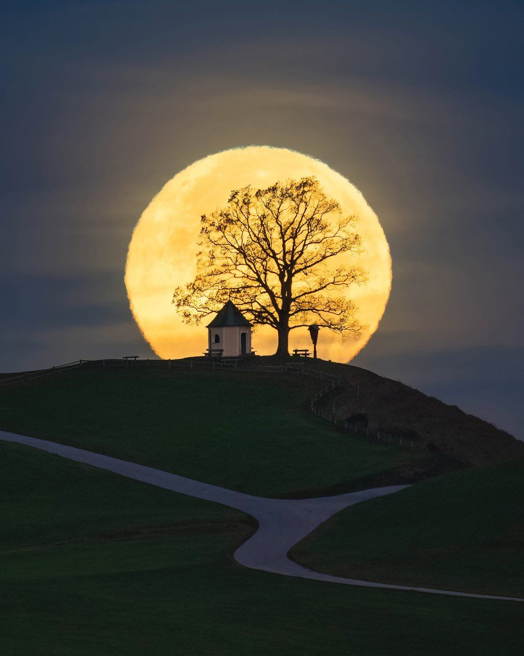 Баварський супермісяць Моя ідея щодо цього супермісяця полягала в тому, щоб сфотографувати його разом із типовими елементами баварського пейзажу: старим деревом і маленькою капличкою. Все вийшло добре,