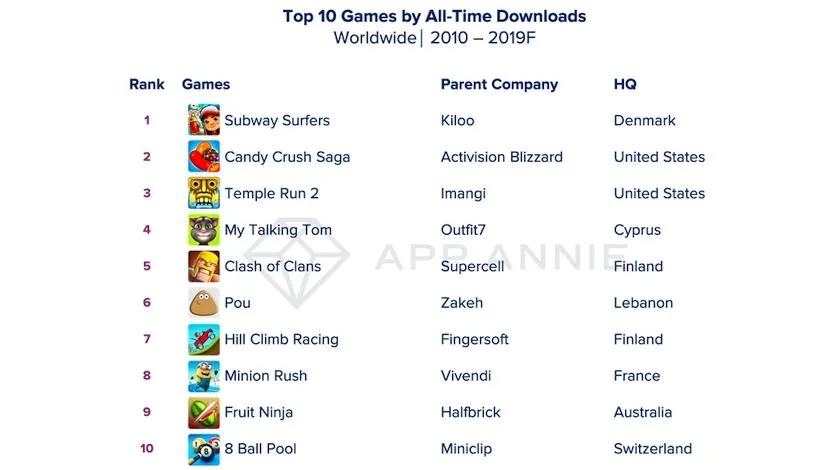 До списку найпопулярніших мобільних ігор останнього десятиліття також потрапили My Talking Tom, Clash of Clans, Pou, Hill Climb Racing. Замикає десятку трійця в лиці Minion Rush, Fruit Ninja та 8 Ball Pool.