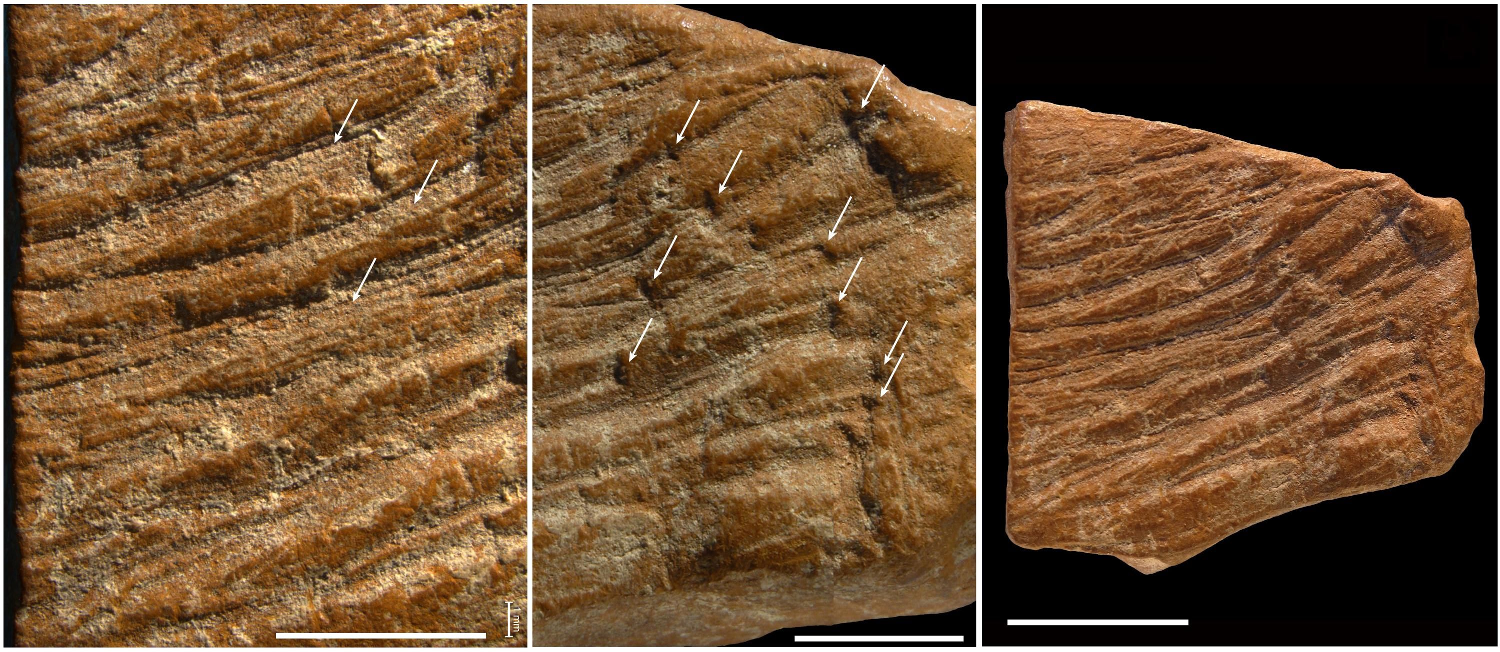 Ще один фрагмент мав гравійовані та відполіровані поверхні, що також вказує на його використання як інструменту для нанесення знаків. Третій шматок мав мікроскопічні сліди багаторазового шліфування та заточування, подібно до крейдоподібного об'єкта.