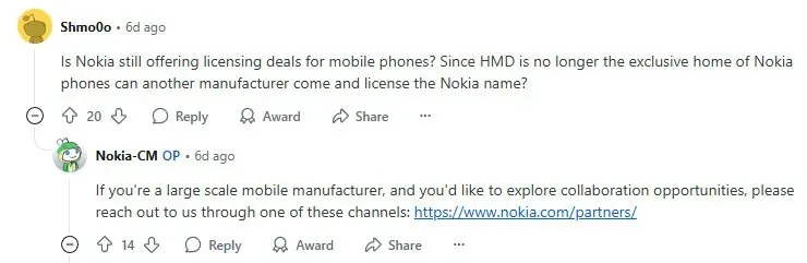 Компанія офіційно підтвердила на платформі Reddit через акаунт Nokia Community Manager, що шукає "великого виробника мобільних телефонів" для співпраці та ліцензування бренду, інформує 24 Канал. Ця інформація була відповіддю на запитання користувача щодо майбутніх угод із ліцензування, що свідчить про те, що компанія ще не знайшла нового партнера після завершення співпраці з HMD.