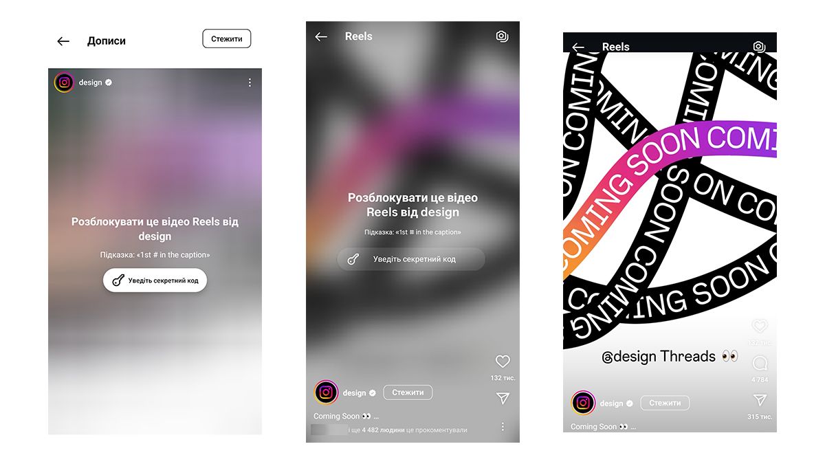 Соціальна мережа, що належить Meta, зараз тестує цю функцію на своєму акаунті Design. Вона поділилася заблокованим роликом, який спонукає глядачів ввести секретний код. Підказка для коду – "перший хештег в описі" до публікації. У цьому випадку кодом є слово "threads".