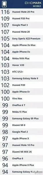 Очолює рейтинг Huawei Mate 20 Pro з оцінкою 116 балів. До сих пір найвищий показник в 109 балів був у представленого на початку року Huawei P20 Pro. Звичайний Mate 20 знаходиться на декілька позицій нижче зі оцінкою 107 балів. Один рядок з ним ділить Google Pixel 3.