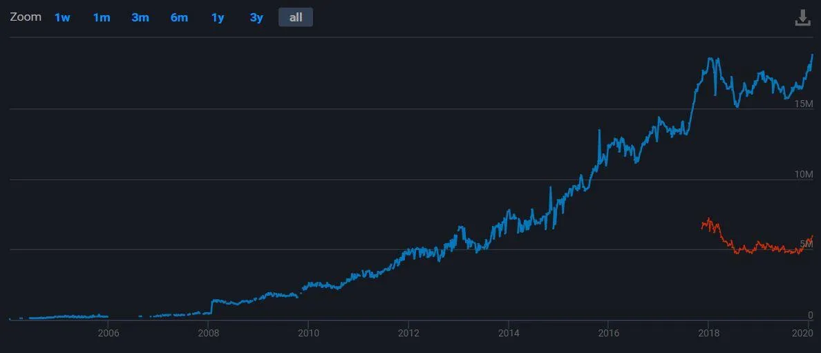 Цікаво, що кількість користувачів, які фактично перебували в цей момент в будь-якій з ігор, помітно менша, ніж два роки тому: приблизно 5,8 мільйона проти приблизно 7 мільйонів.