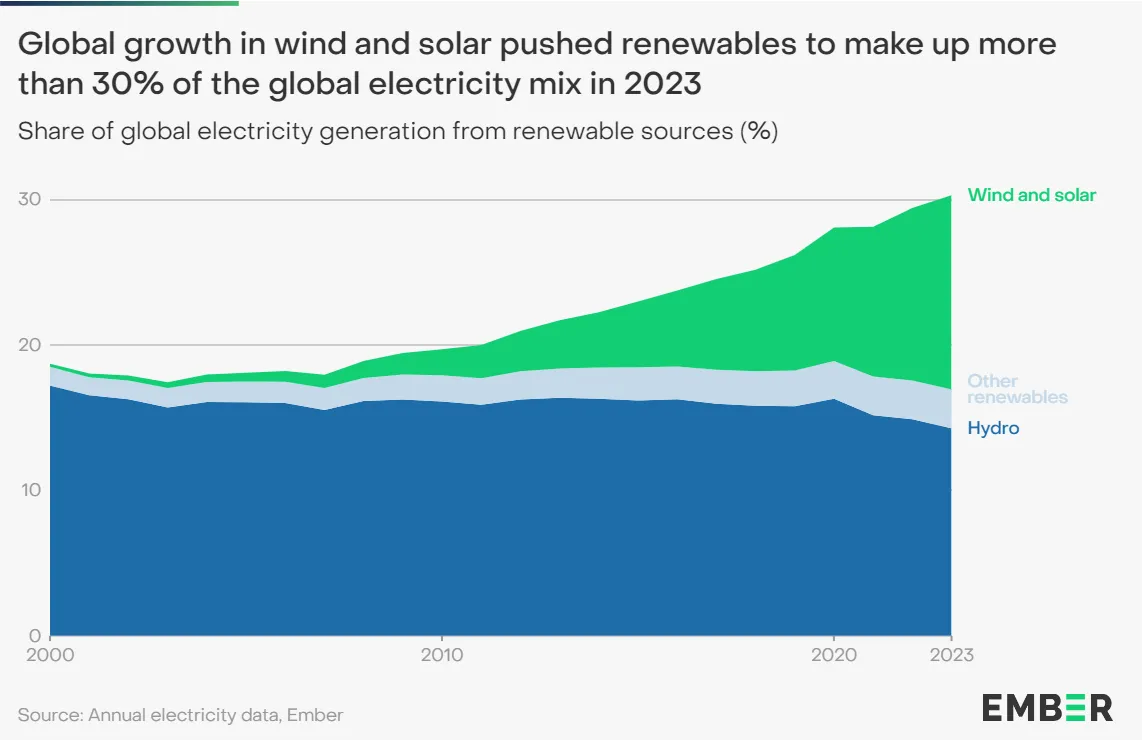 Цей зсув у бік відновлюваної енергетики є помітним відходом від минулих трендів, коли у 2000 році частка відновлюваних джерел у світовому виробництві електроенергії становила лише 19%.