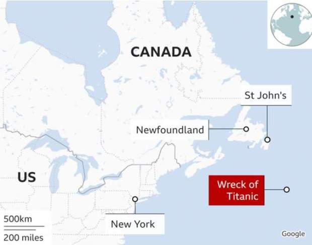 Місце аварії "Титаніка" та приблизна зона пошуків субмарини / Фото BBC