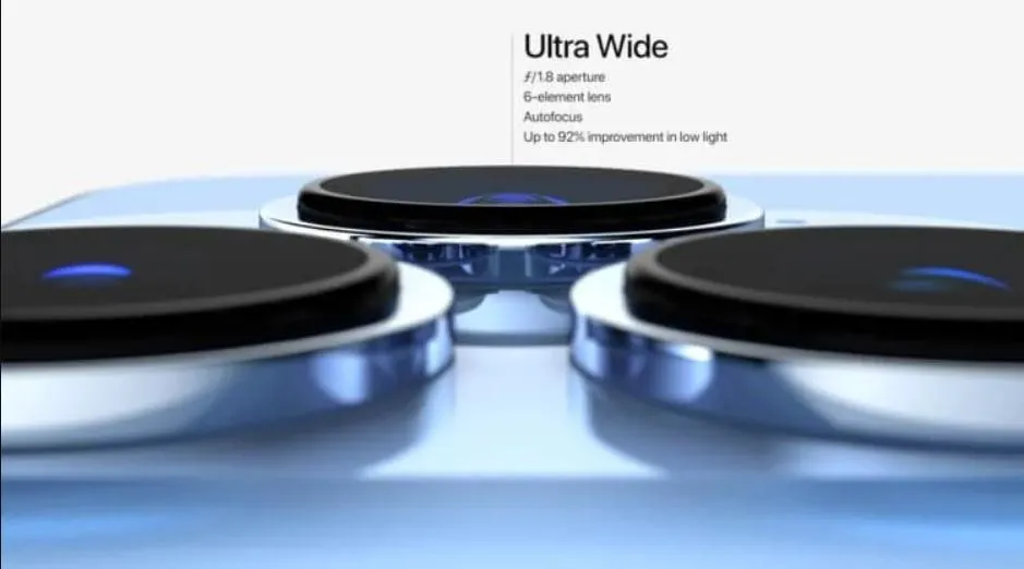 - Ширококутна камера має сенсор з пікселями 1,9 мкм - найбільший з коли-небудь існували на iPhone, відзначили в Apple. У поєднанні зі збільшеною діафрагмою широкоугольная камера на iPhone 13 Pro і iPhone 13 Pro Max забезпечує значне поліпшення в умовах низької освітленості: до 2,2 рази в порівнянні з iPhone 12 Pro і майже в 1,5 рази в порівнянні з iPhone 12 Pro Max.