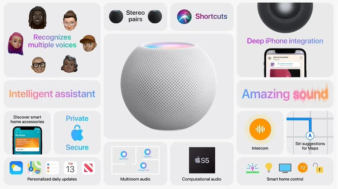 Розпочала свою презентацію Apple з анонсу колонки HomePod mini, яка доповнила лінійку моделі, яку презентували ще в 2017 році. Новинка отримала низку розумних функцій та корисних нововведень, таких, як аналіз оточення та підлаштування звуку, розпізнавання користувачів та режим "рації" Intercom.