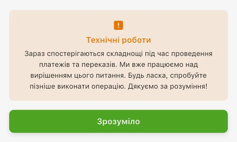 Зараз спостерігаються складнощі під час проведення платежів та переказів. Ми вже працюємо над вирішенням цього питання. Будь ласка, спробуйте пізніше виконати операцію. Дякуємо за розуміння!,