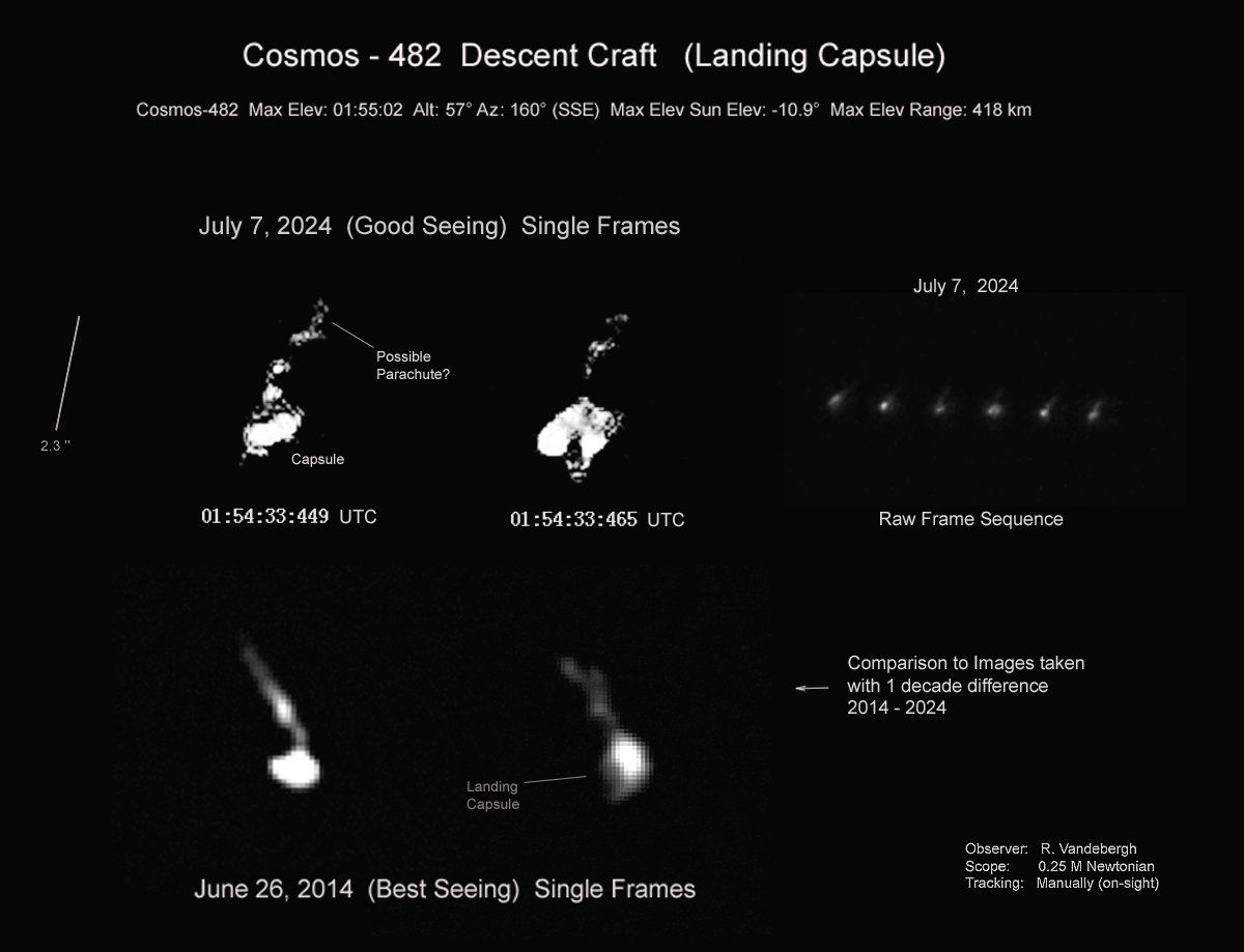 Нові супутникові знімки вказують на те, що радянський космічний апарат, який от-от впаде на Землю, може тягнути за собою щось, схоже на парашут. На фото, опублікованих нещодавно, видно структуру, яка тягнеться за зондом "Космос 482" – це може бути частина системи гальмування, що мала допомогти йому сісти на Венеру. Однак існують сумніви, чи зможе він уповільнити падіння, повідомляє 24 Канал з посиланням на астрофотографа Ральфа Вандеберга.