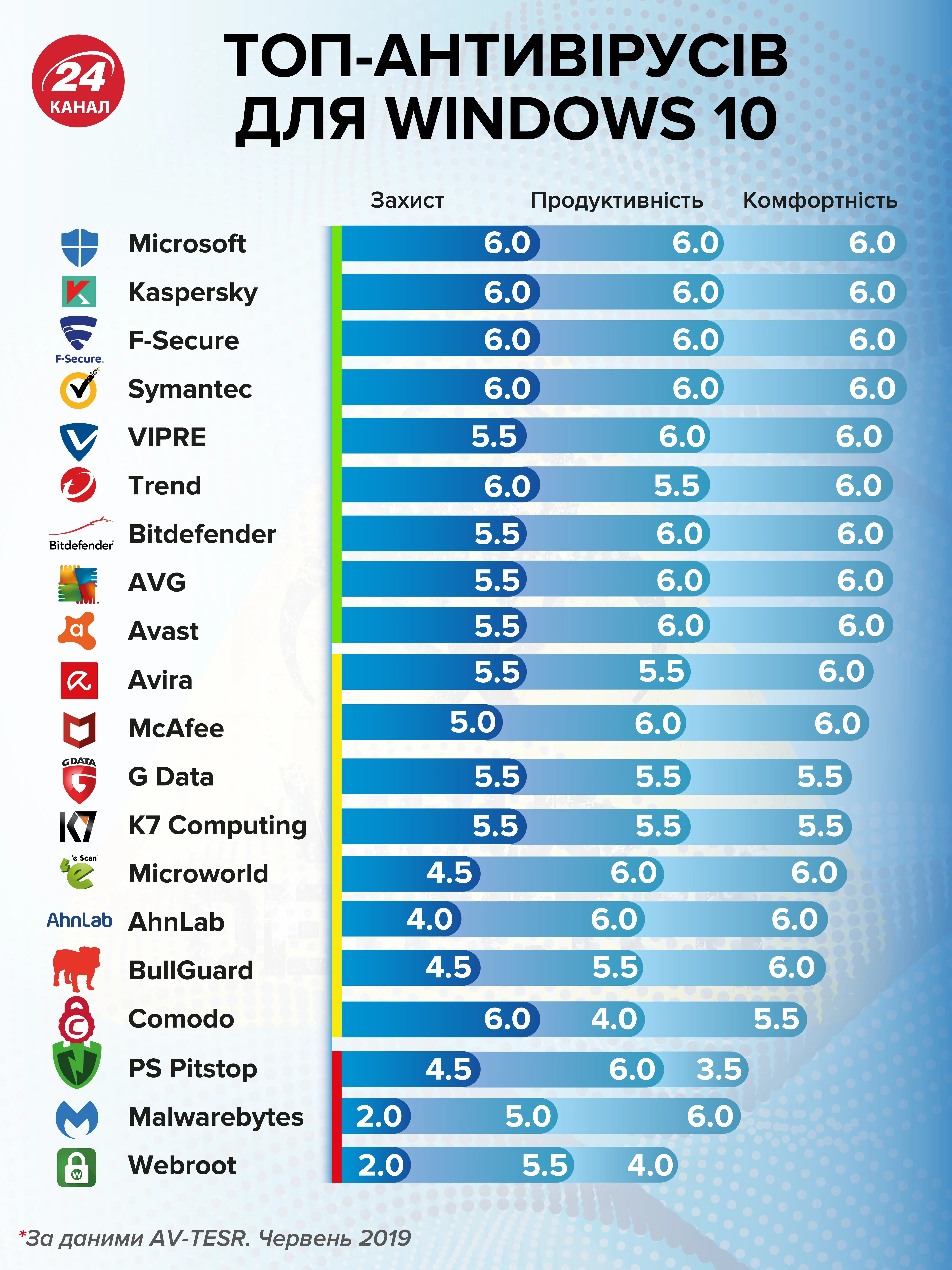 Інші популярні продукти, такі як Avast Free Antivirus, AVG Internet Security, Bitdefender Internet Security, Trend Micro Internet Security, VIPRE Security AdvancedSecurity, набрали 17,5 балів.