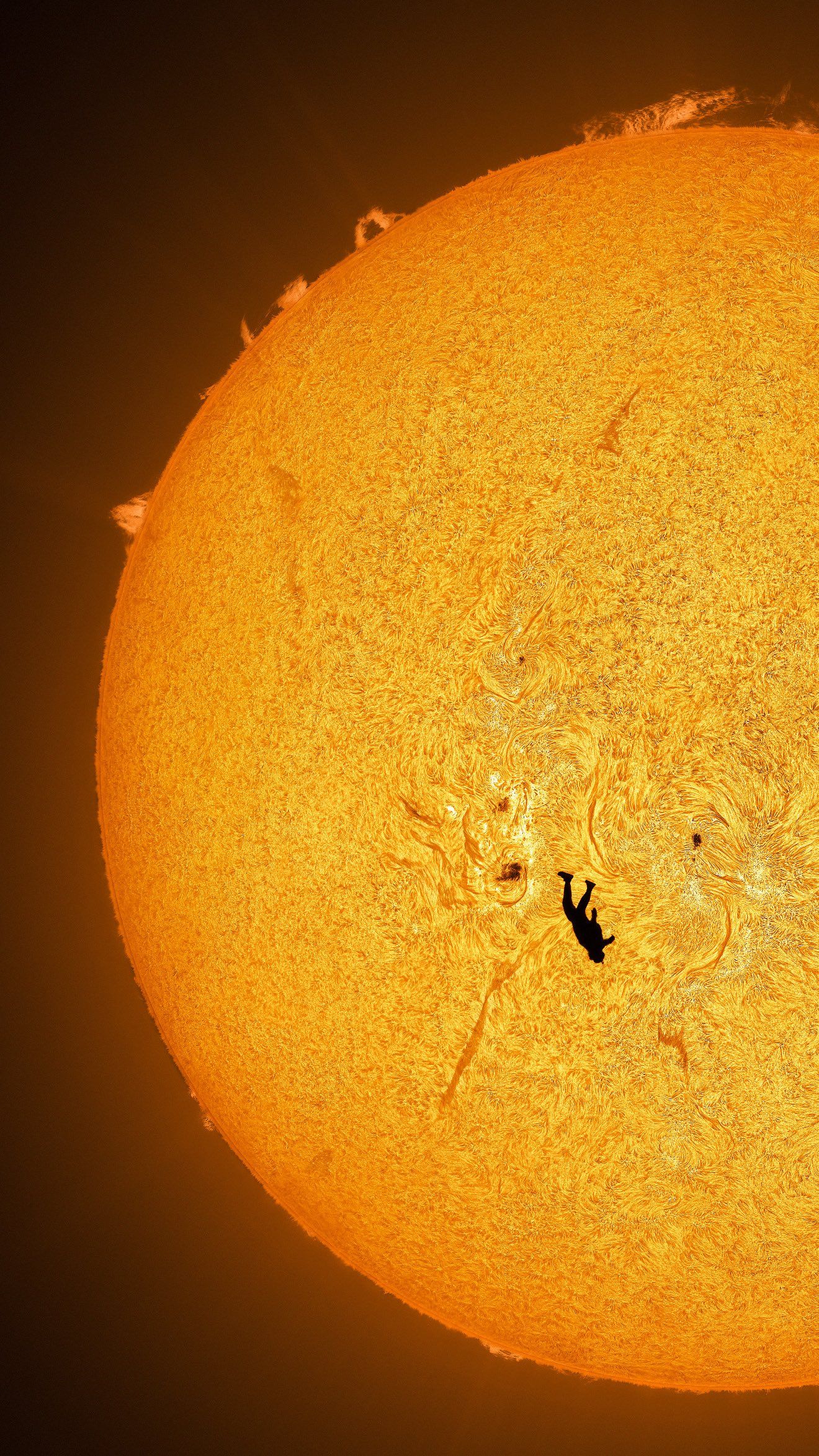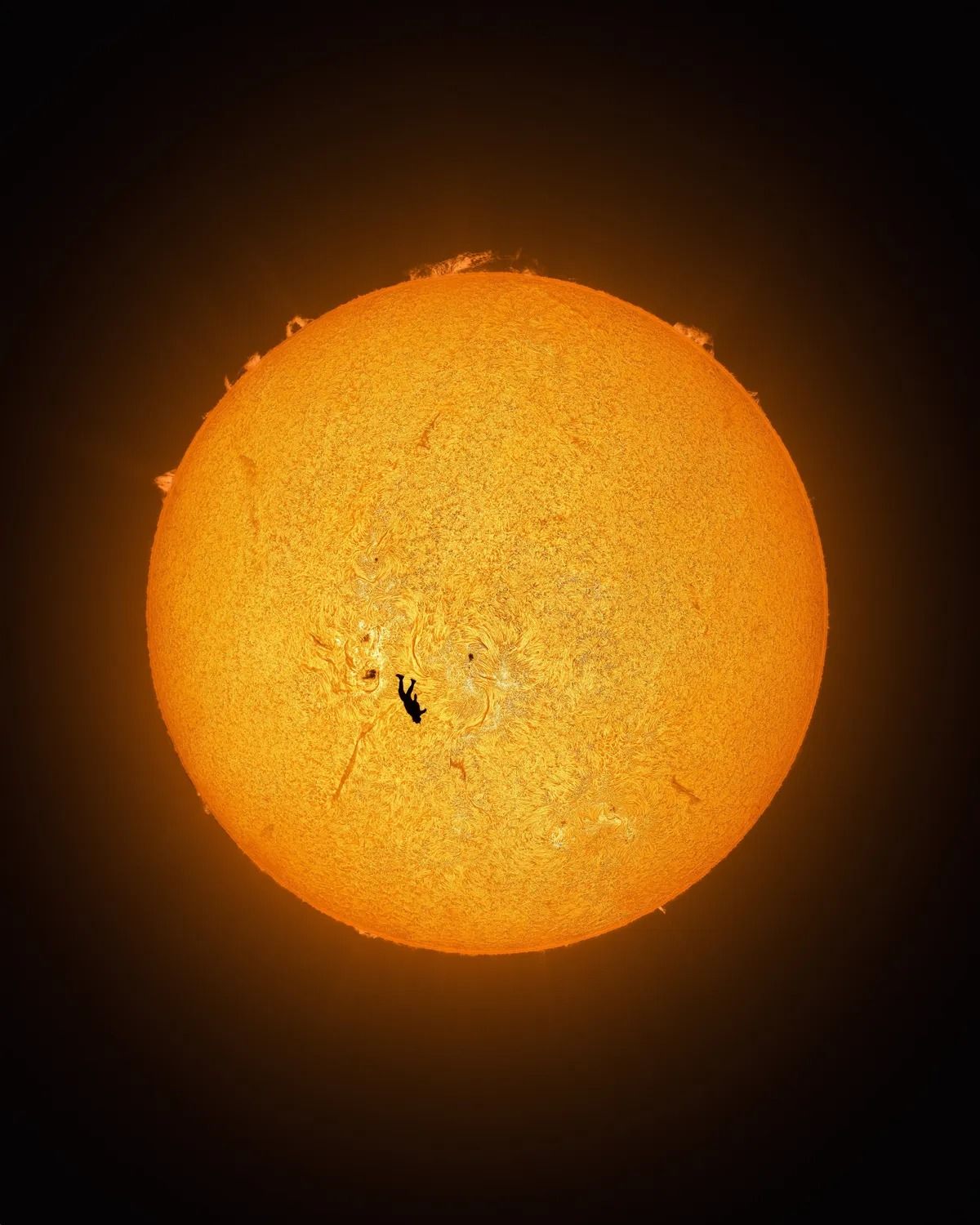 Потребовалось шесть попыток в течение часа. Солнце постоянно поднималось, меняя углы и усложняя задачу. На последнем закате, когда все выстроилось идеально, Эндрю дал команду, и Гейб прыгнул. Силуэт скайдайвера, рассекающего солнечную активность, стал основой работы "Падение Икара". Для создания полного контекста финальное изображение позже дополнили мозаикой из более 100 кадров солнечного диска.