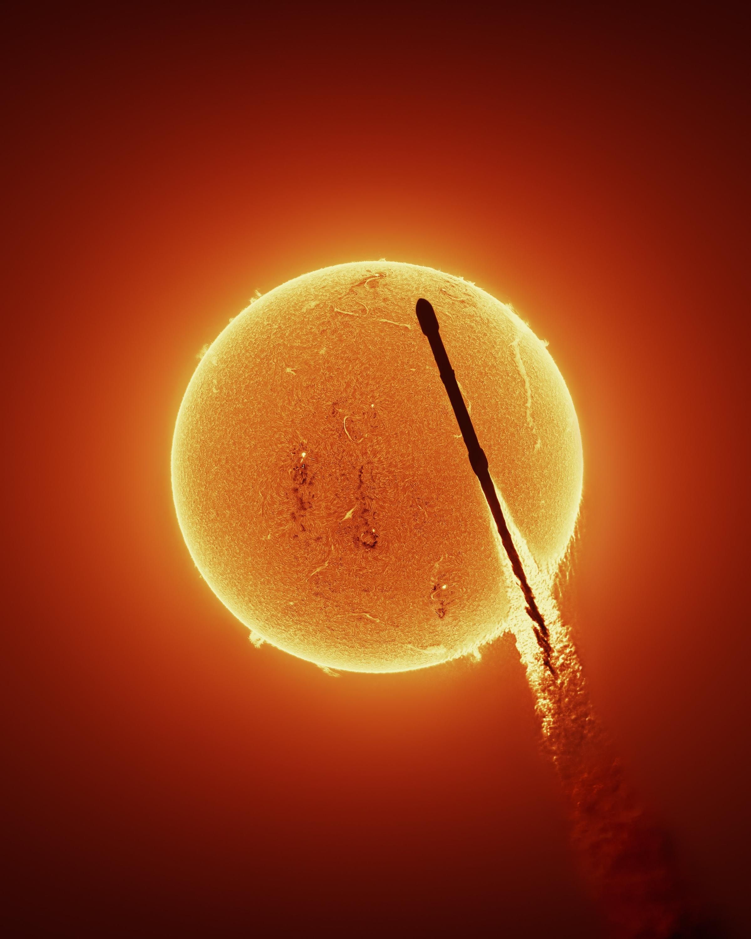 Идея этого невероятного кадра возникла после того, как МакКарти (Andrew McCarthy) сфотографировал ракету SpaceX Falcon 9 на фоне Солнца, используя водородный альфа-фильтр.