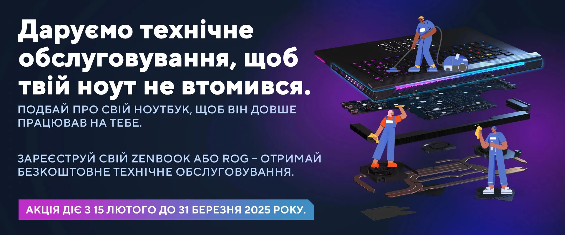 Акция "Дарим ТО, чтобы твой ноут не устал" предоставляет новым зарегистрированным пользователям ноутбуков ASUS линейки Zenbook и ноутбуков бренда ROG возможность бесплатно пройти комплексное техническое обслуживание своих устройств. Подробнее об условиях для участия в акции: