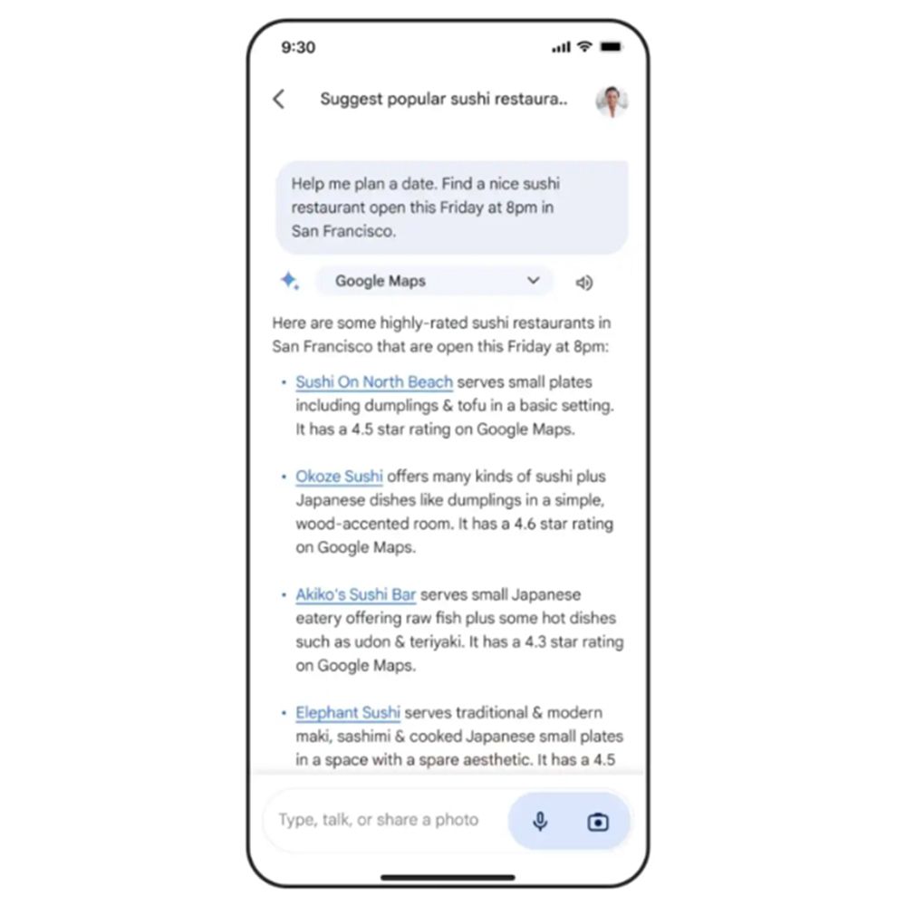 Вы также можете создавать текст и изображения, пользоваться интеграцией с другими службами Google, такими как Карты, Gmail, Полеты, YouTube и другие, чтобы быстро получать информацию от ИИ-помощника. Например, он может ответить на вопрос о событии из вашего календаря или проанализировать письмо на почте.