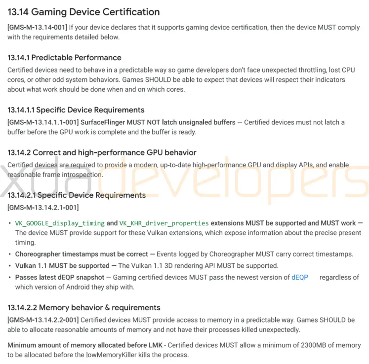 Какие требования будут выдвигаться к геймерским смартфонам? Один из его разделов детально описывает дополнительные требования к сертификации игровых Android-устройств. В частности, такие гаджеты должны пройти последние тесты на соответствие требованиям OpenGL ES и Vulkan.