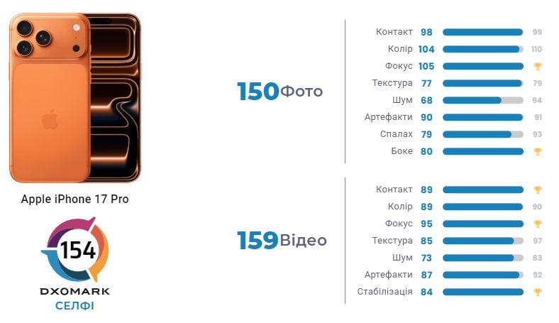 - iPhone 17 Pro получил звание смартфона с лучшей фронтальной камерой, набрав 154 балла в рейтинге DxOMark благодаря новому 18-мегапиксельному сенсору.