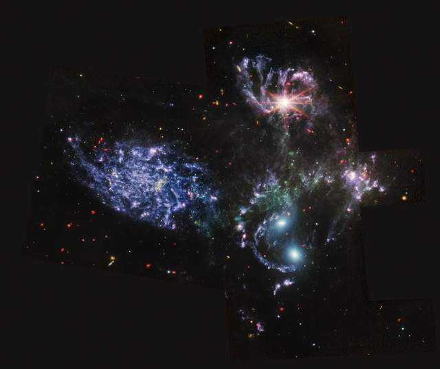 К примеру, при съемке только в среднем инфракрасном диапазоне можно рассмотреть ударные волны от взаимодействия четырех близких галактик, чего не видно при съемке с "Хаббла" и с камеры "Уэбб" в ближнем инфракрасном диапазоне.