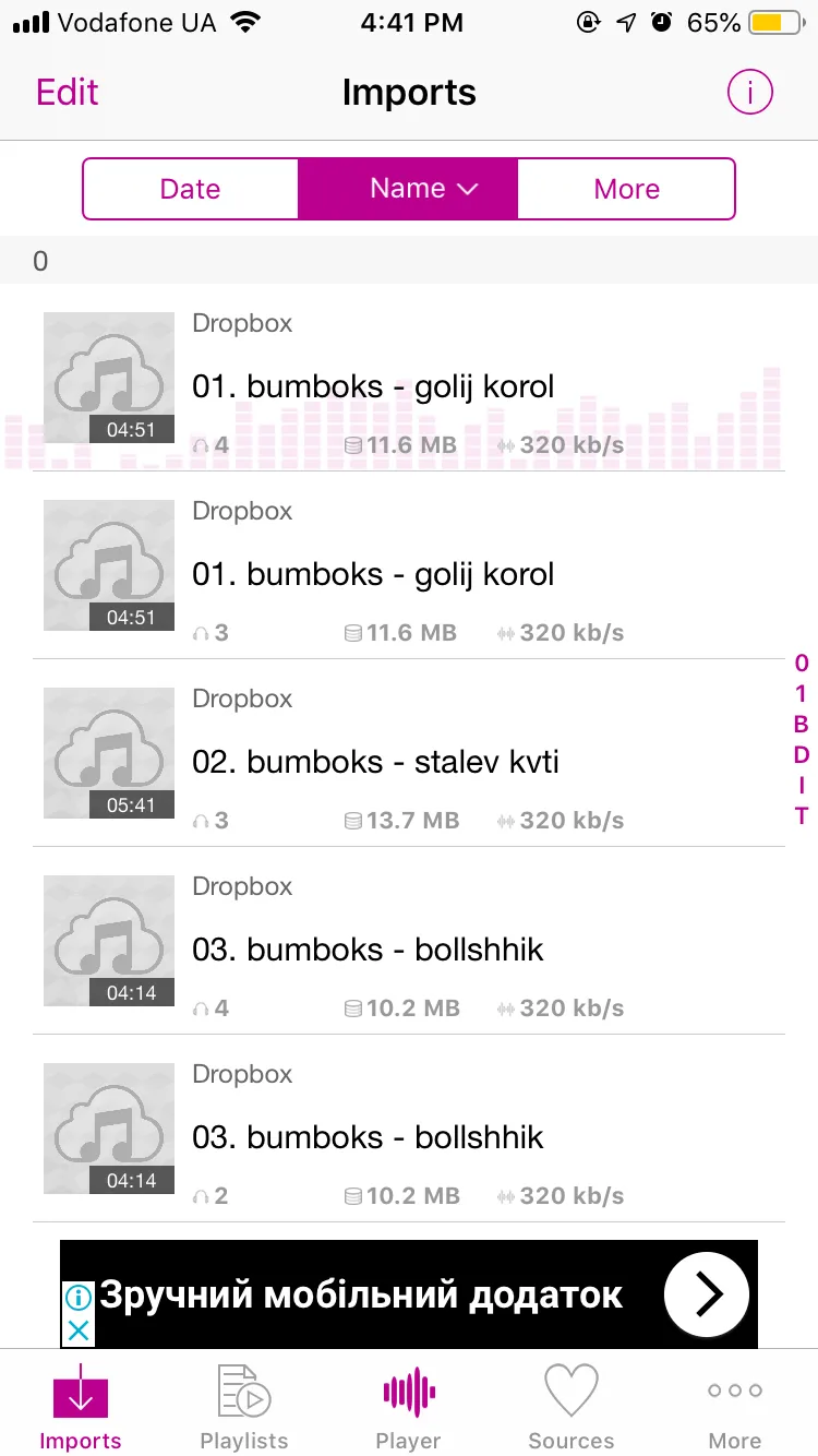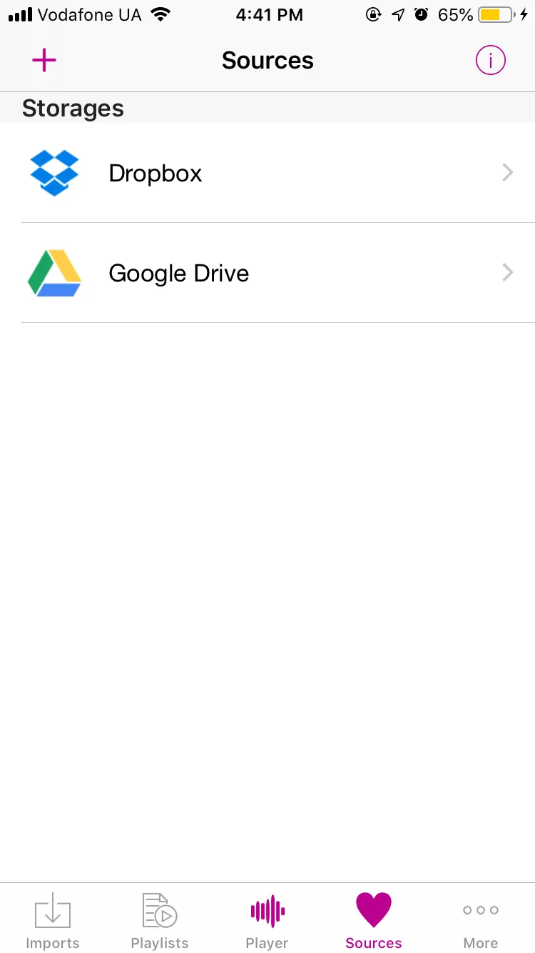В этом приложении есть как свои плюсы, так и минусы. Скачать музыку в приложение максимально просто: скачиваете его на Google Диск или Dropbox. Потом в программе выбираете пункт Sources и необходимый файлообменник. Музыка будет доступна для прослушивания, однако для оффлайн воспроизведения нужно будет ее сохранить, нажав пункт Imports.