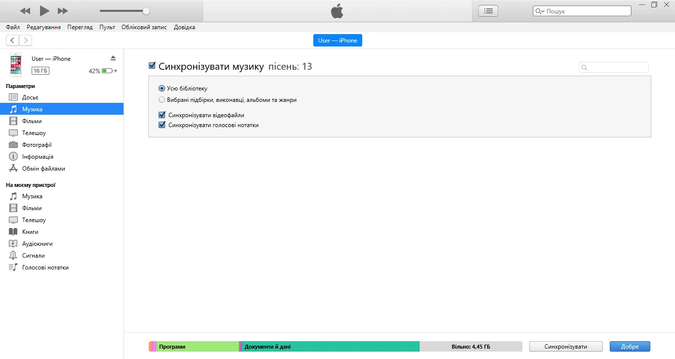 6. Далее перейдите в раздел "Музыка" и поставьте галочку напротив пункта "Синхронизировать музыку". Здесь можно выбрать подпункт "Всю библиотеку", или же синхронизировать отдельные подборки.
