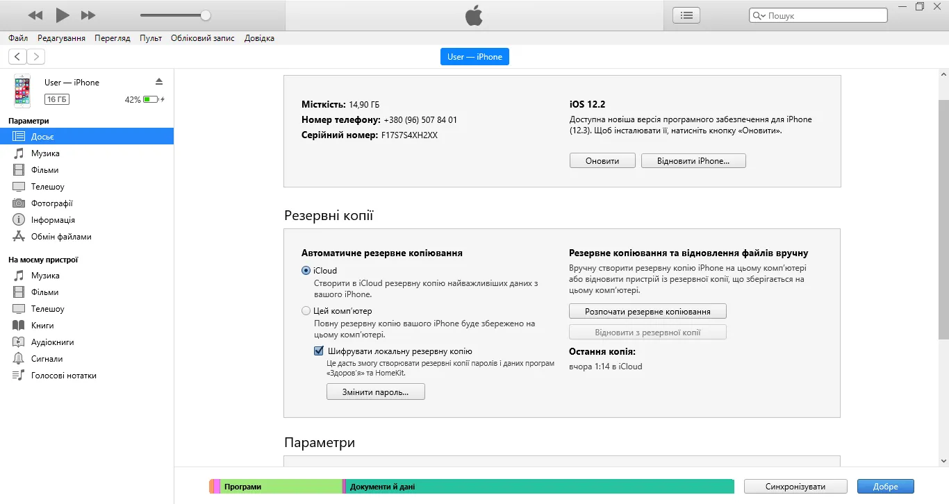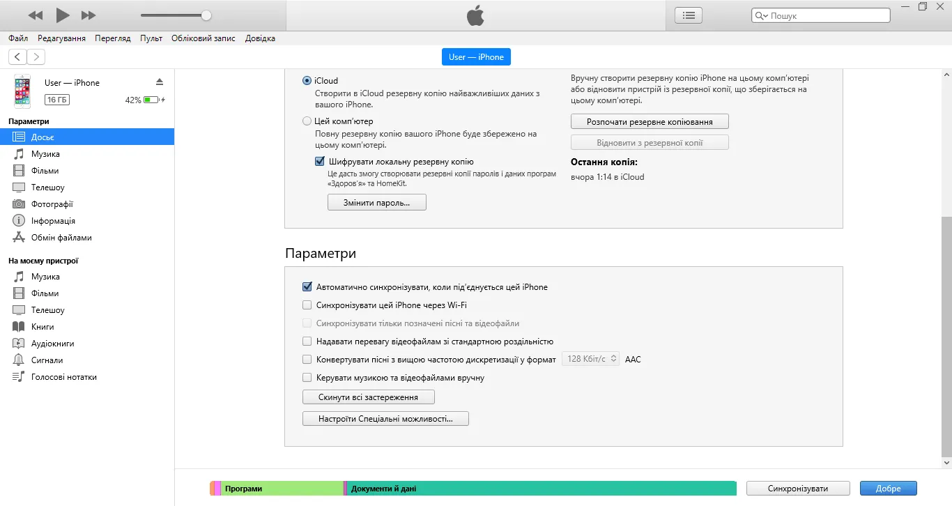 5. Для того, чтобы синхронизировать медиафайлы с iTunes на смартфоне, нажмите на иконку смартфона. Далее перейдите в раздел "Досье" и выберите пункт "Автоматически синхронизировать, когда подключается этот iPhone".