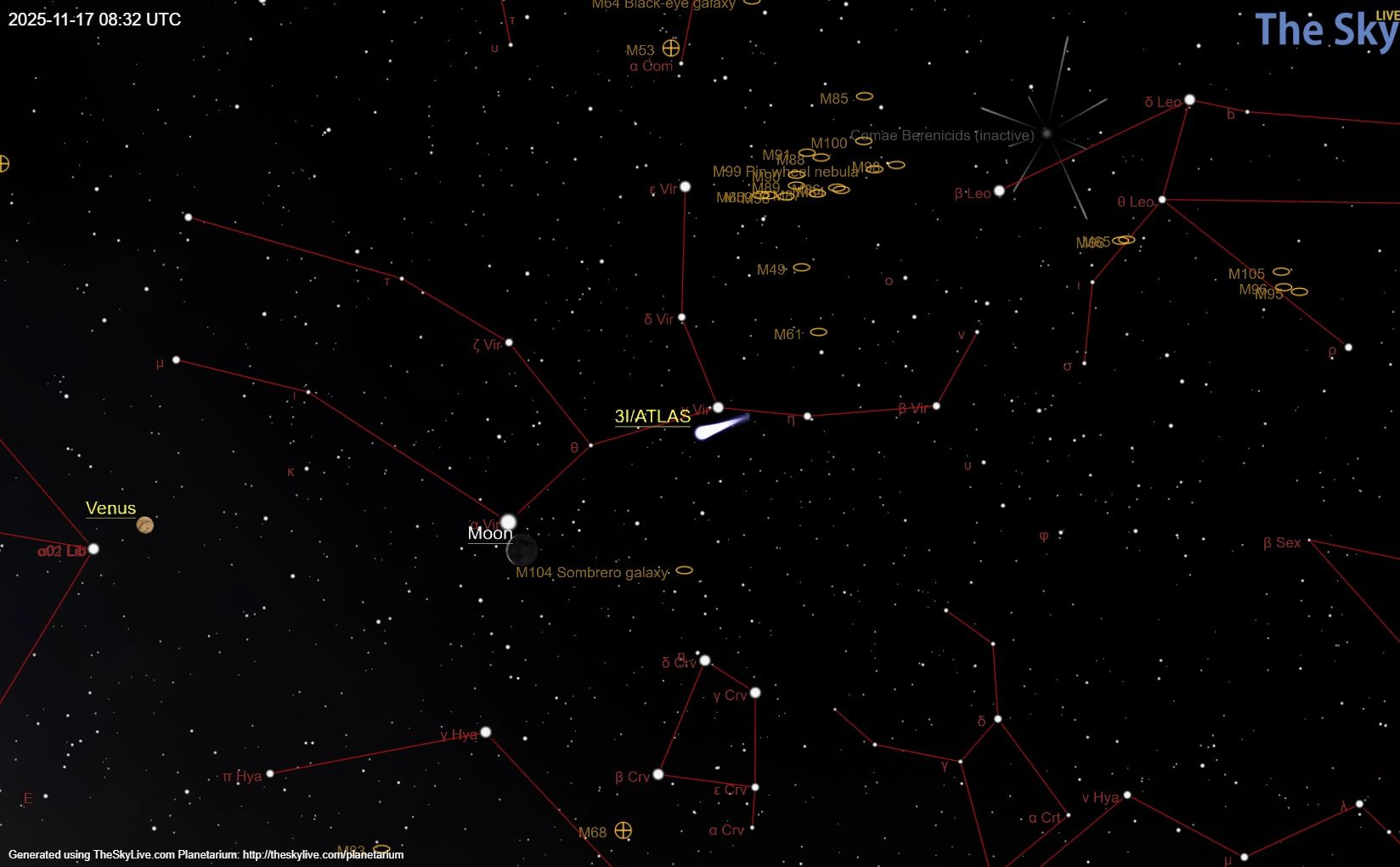 Где же сейчас находится межзвездная комета "Атлас"? Согласно данным TheSkyLive, 17 ноября 2025 года комета 3I/ATLAS находится в созвездии Девы.