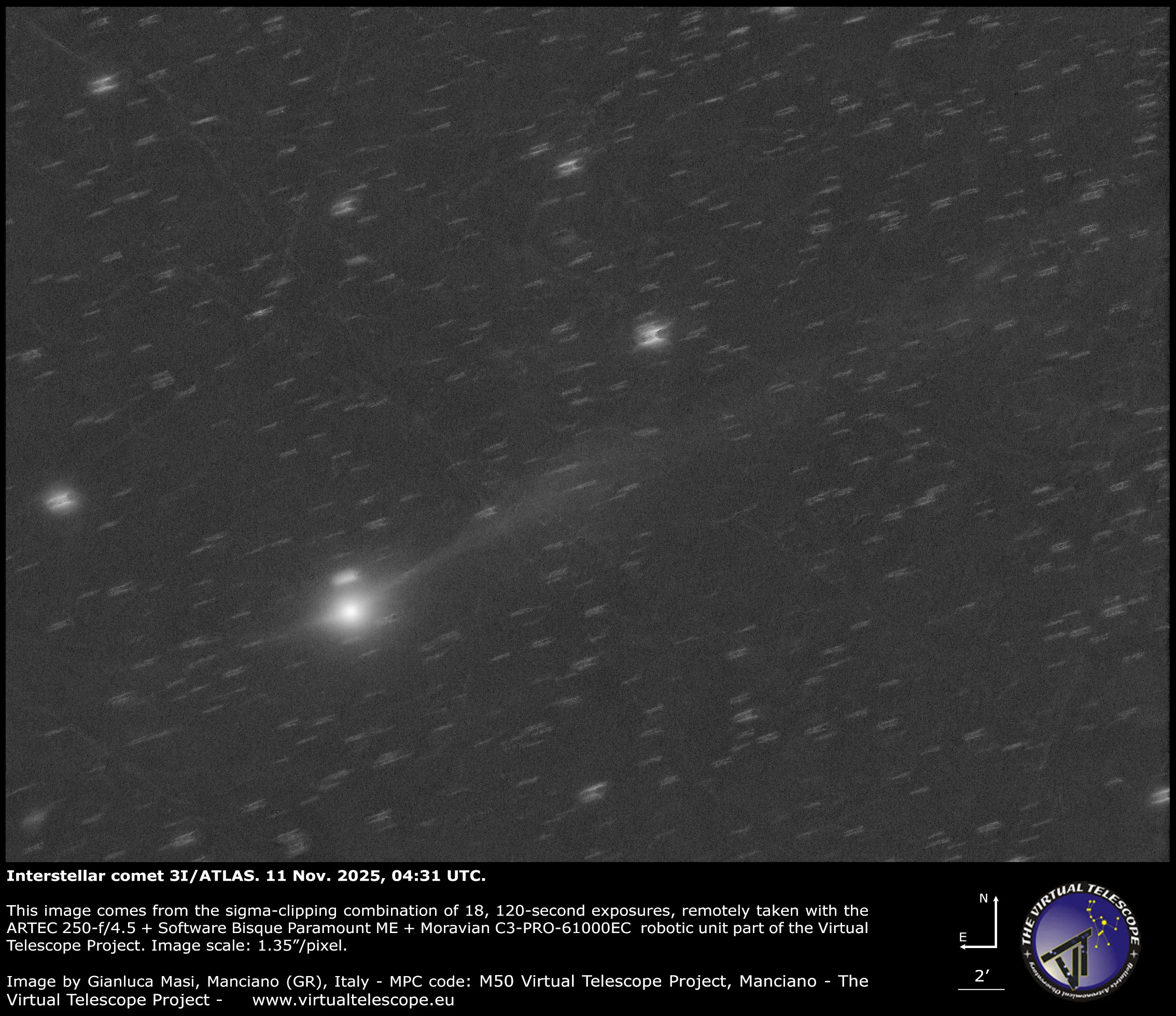 Недавно сстрономы получили новое изображение межзвездной кометы 3I/ATLAS с четко выраженным ионным хвостом, сделанное с помощью роботизированных телескопов в Италии.