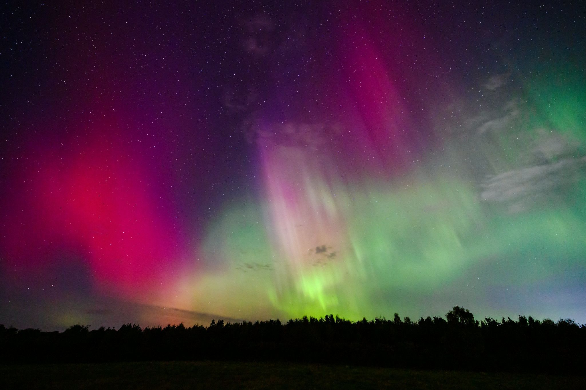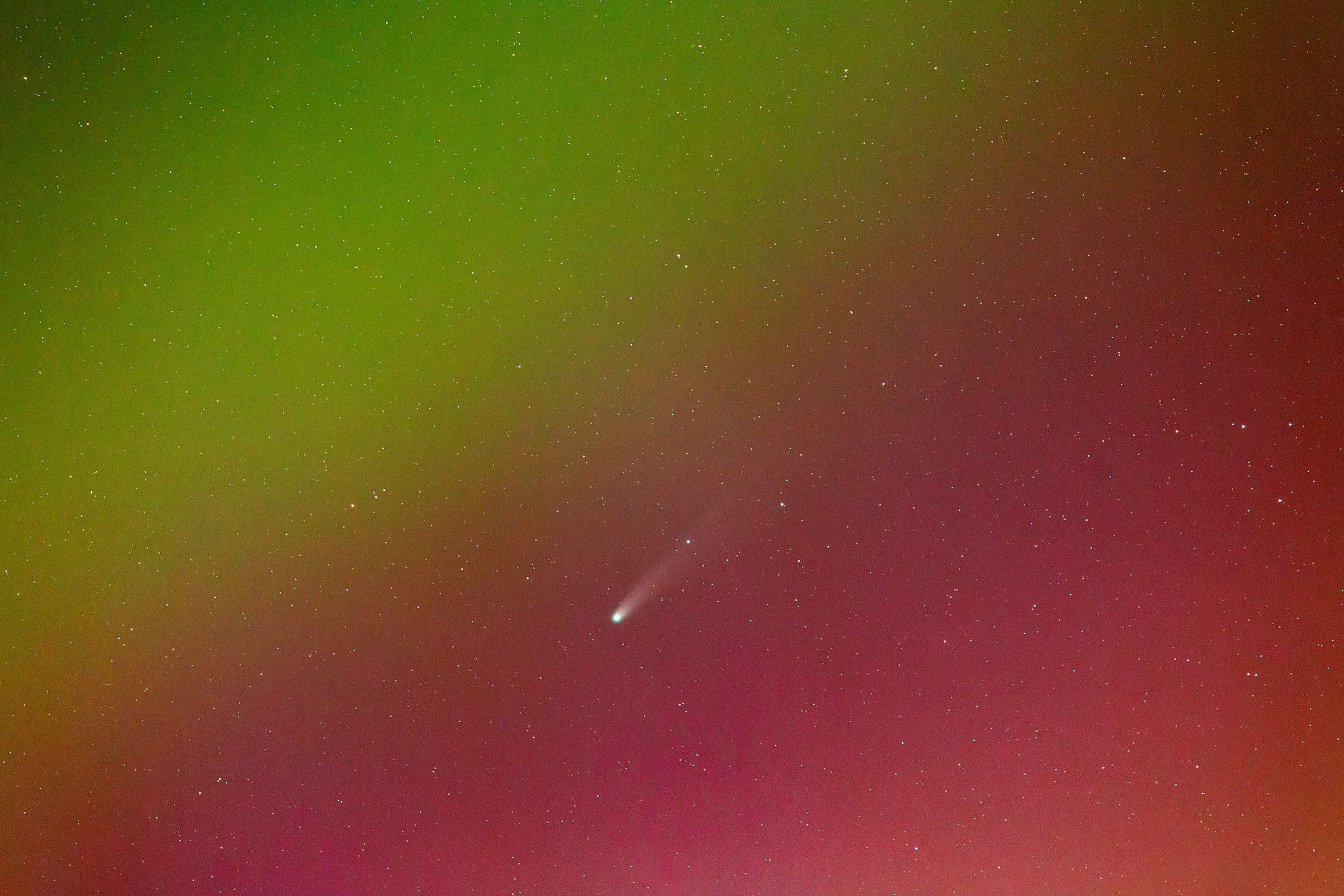 Между тем другой фотограф, Алан Таф из Шотландии, зафиксировал комету на фоне чрезвычайно яркого полярного сияния. Оно стало результатом неожиданной геомагнитной бури класса G2, вызванной корональным выбросом массы на Солнце, который достиг нашей планеты с опозданием. Благодаря этому шторму ночное небо вспыхнуло редкими оттенками, включая не только типичные зеленые и красные, но и розовые и оранжевые цвета, что создало невероятный фон для кометы.