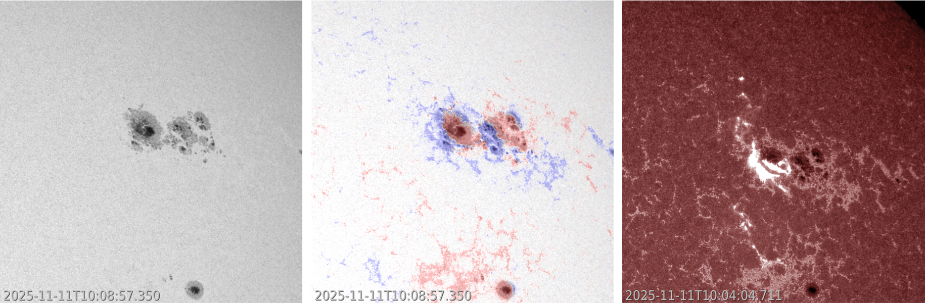 Эта большая группа солнечных пятен все еще имеет очень сложную структуру, как можно увидеть на сравнении. Синий и красный в центральном изображении обозначают противоположные магнитные полярности. Третье фото показывает изображение в полном ультрафиолетовом диапазоне (FUV) в момент пика вспышки. Белый цвет – это сама вспышка / Фотоколлаж Solar-Terrestrial Centre of Excellence Search