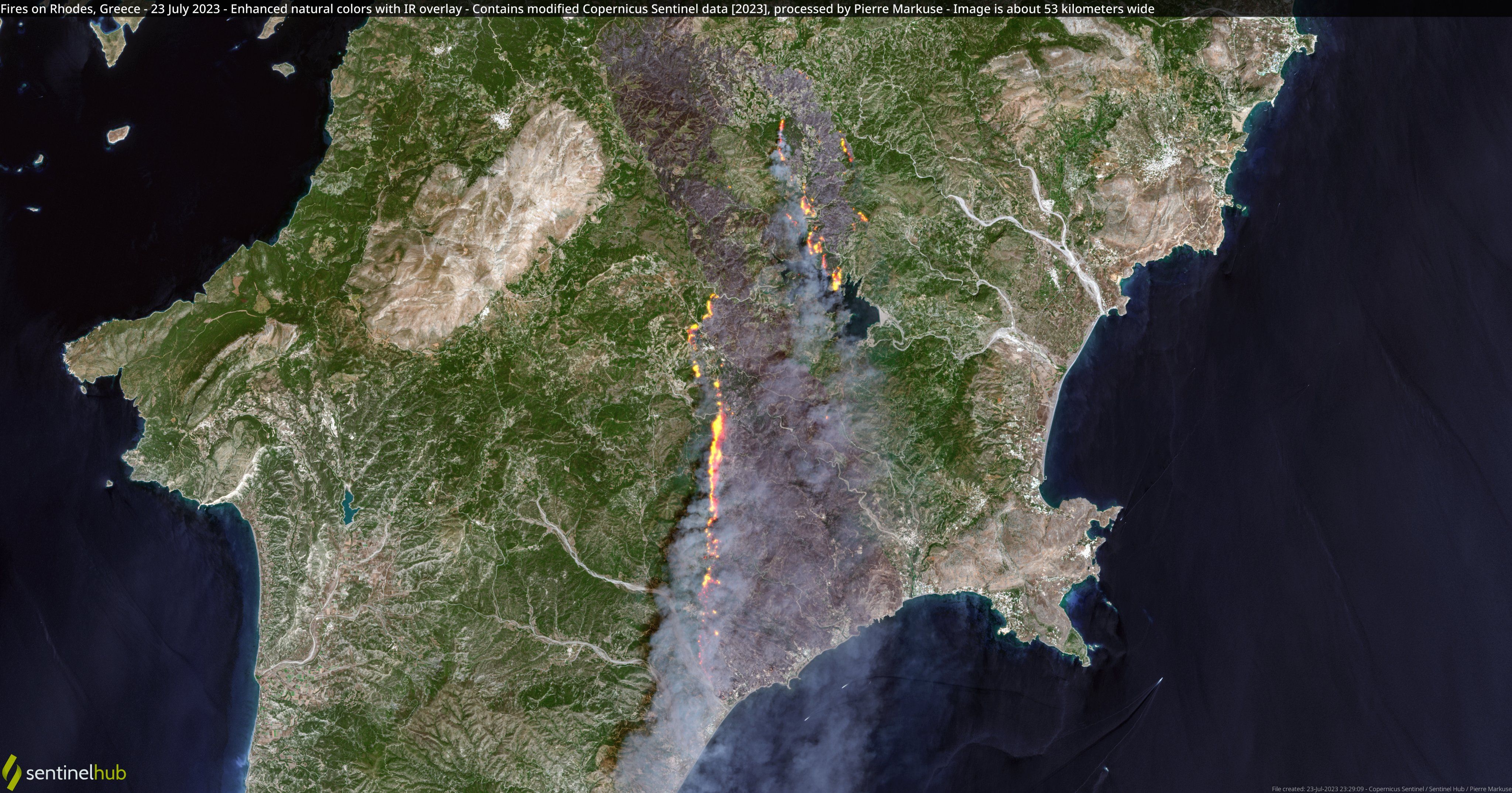 Масштабы лесных пожаров и их влияние на греческие острова тщательно отслеживали разные спутники наблюдения за Землей. Миссия Copernicus Sentinel-2, совместная работа Европейского Союза и Европейского космического агентства, предоставила поразительные изображения пожаров на Родосе 23 июля. Редактор спутниковых изображений Пьер Маркузе поделился фотографией пламени, распространяющимися от горных районов до побережья, сопровождаемые густыми облаками поднимающегося в небо дыма.
