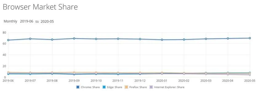 Что касается рынка десктопных браузеров, то по итогам мая наблюдается незначительный рост Chrome с 69,81% до 70%. Edge также несколько увеличил свою долю с 7,76% до 7,86%, а вот популярность Firefox упала с 7,25% до 7,23%.
