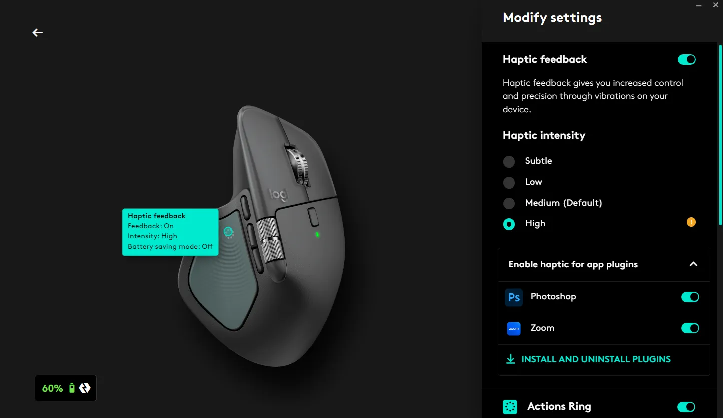 Actions Ring– это вторая важная инновация и "персональный ускоритель рабочих процессов", как его называют в Logitech. Это специальное настраиваемое кольцо вокруг одной из кнопок мышки, которое по умолчанию привязано именно по Haptic Sense Panel.