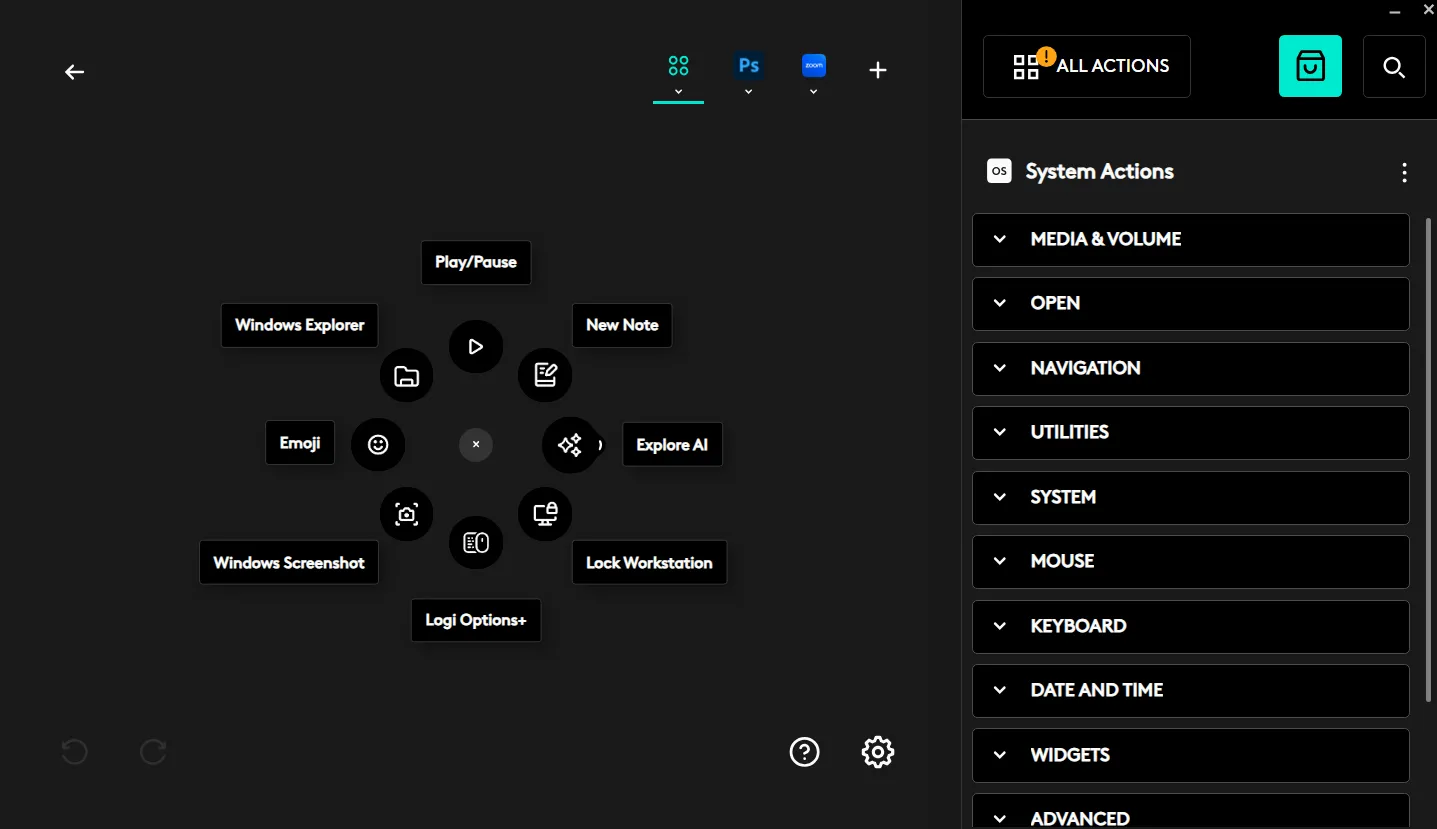 При нажатии на панель, на экране отображается кольцо быстрых функций. Его можно тонко настроить под себя для выполнения разных задач, шорткатов, вызова ИИ или любых других программ, а также Actions Ring можно перемапить на любую другую кнопку мышки в приложении Logi Options+. Именно здесь, кстати, можно также создать свое уникальное Actions Ring с нужным набором действий для каждой программы, в которой вы работаете.
