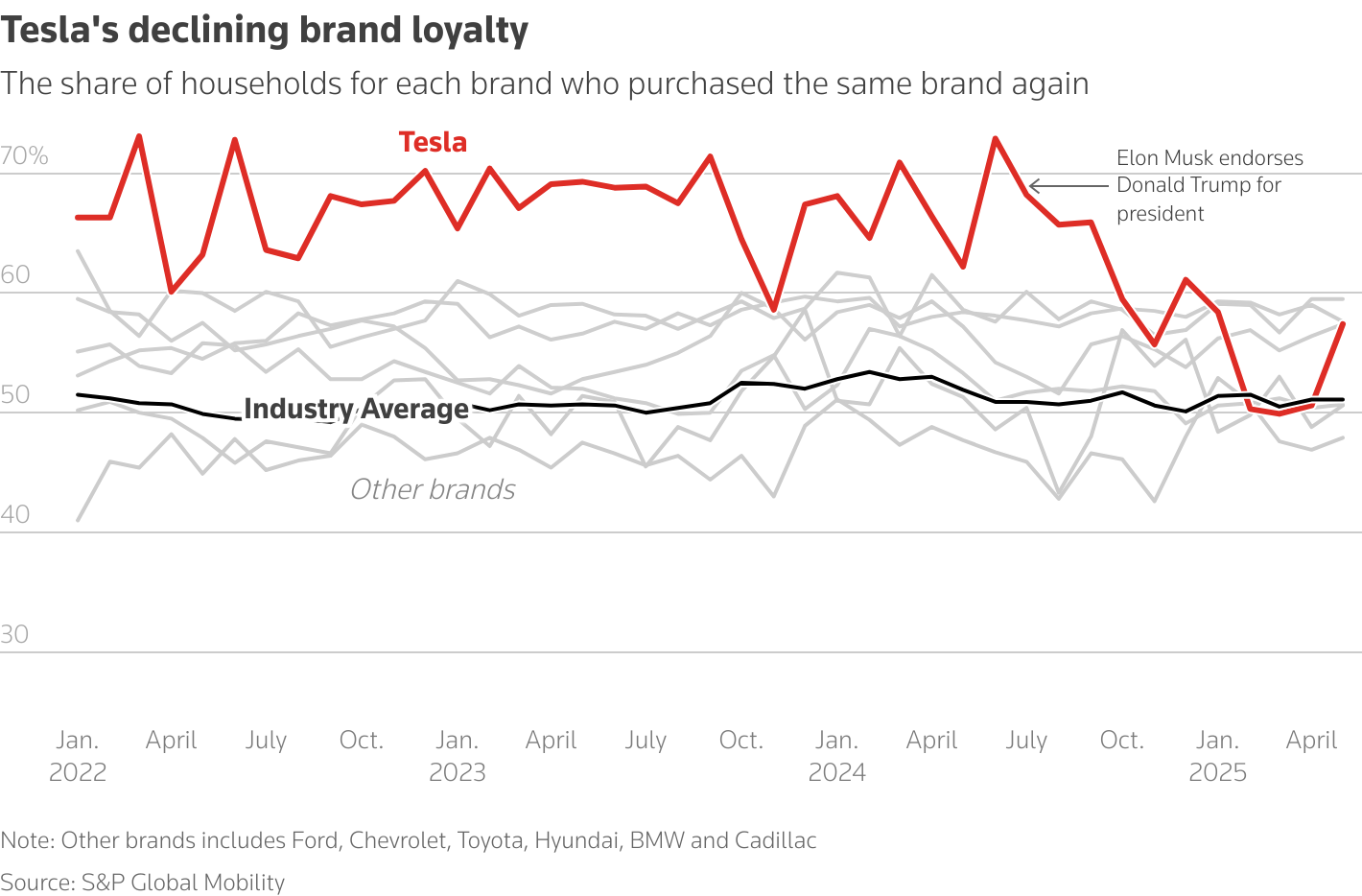 - Политические споры между Маском и Трампом, в частности поддержка Маском Трампа после покушения на него в 2024 году, усилили негативные настроения среди потребителей, что повлияло на продажи Tesla, в частности в Китае, где они упали на 8,4% в июле 2025 года.