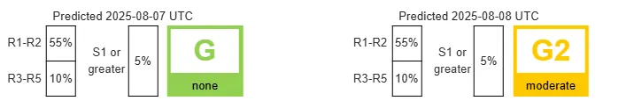 Как рассказал исследователь Юре Атанацков на своей странице в X, модель NASA WSA-ENLIL показывает, что касательный удар возможен 8 августа примерно в 9:00 по киевскому времени (с погрешностью ±8 часов).