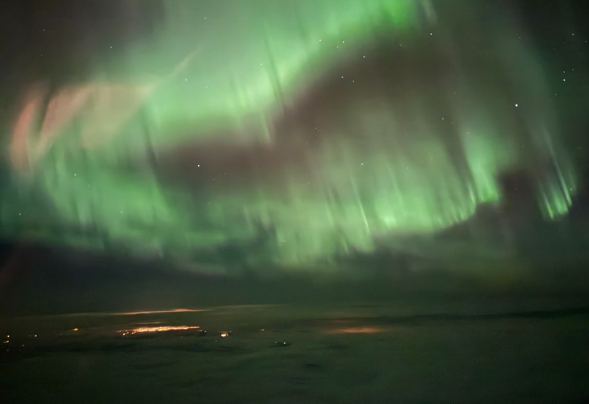 Пилот Скотт Райтс сделал фото северного сияния 13 марта над Исландией во время умеренной геомагнитной бури, когда летел из Великобритании в штат Кентукки, США:
