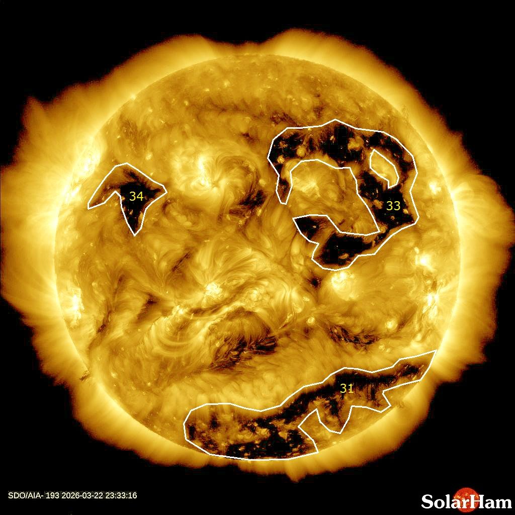 Коронные дыры на Солнце по состоянию на 23 марта 2026 года / Фото SDO/AIA/SolarHam