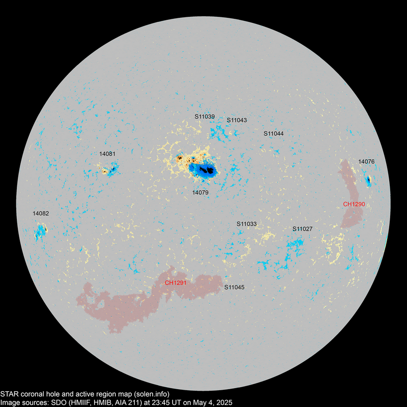 Карта солнечных пятен и корональных дыр по состоянию на 5 мая 2025 года / Фото NASA/SDO