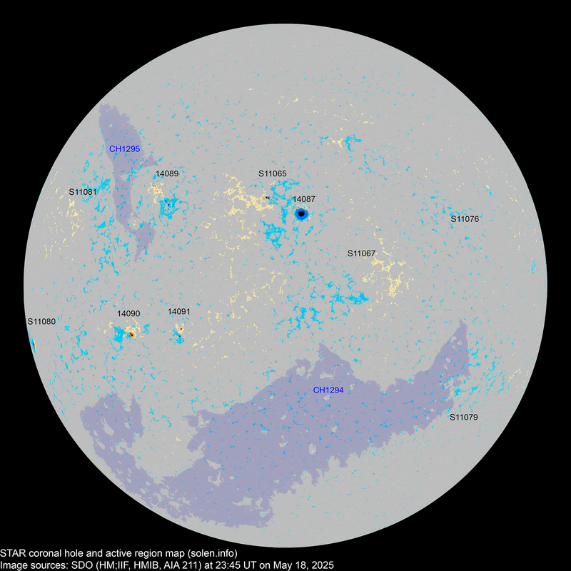 Карта солнечных пятен и корональных дыр по состоянию на 19 мая 2025 года / Фото NASA/SDO