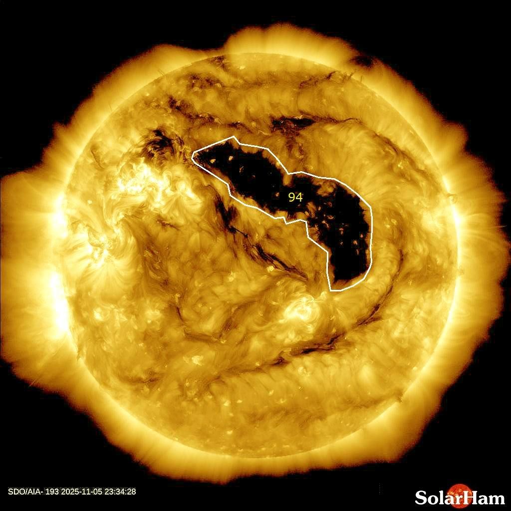 Выброс также будет усилен солнечным ветром из большой корональной дыры на Солнце / Фото SolarHam